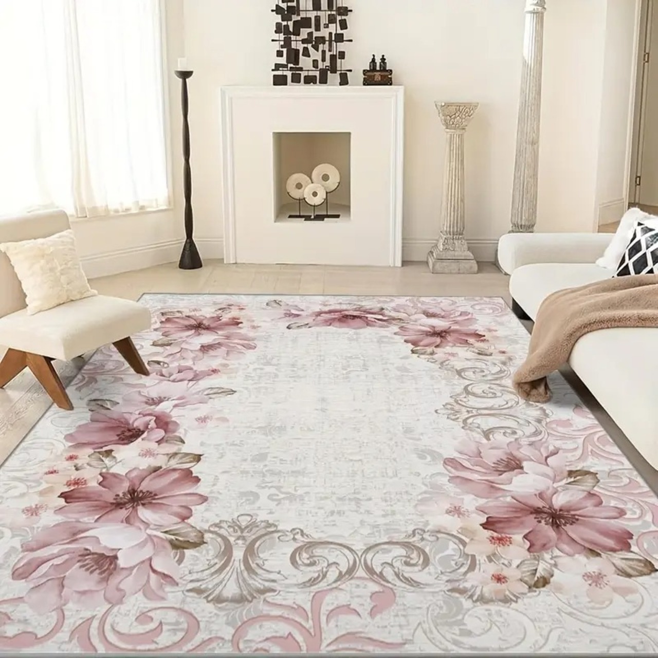 ラグ カーペット 花柄 洗える ベルベット調 マット おしゃれ かわいい インテリア 北欧 絨毯 柄物 エレガント 洗濯機可 滑り止め 大きい ピンク系 アイボリー リビング 寝室 ダイニング 客室 160×200cm | Calm+(カームプラス) - 北欧風ナチュラルインテリア・モダン家具専門店