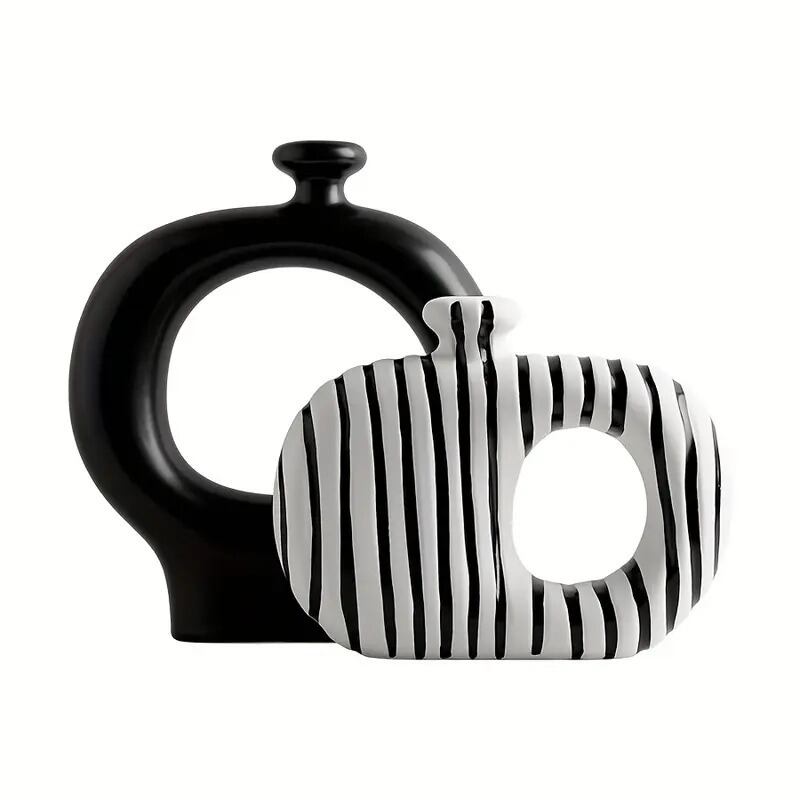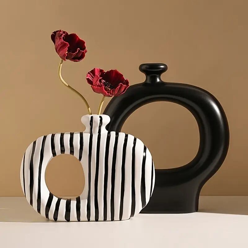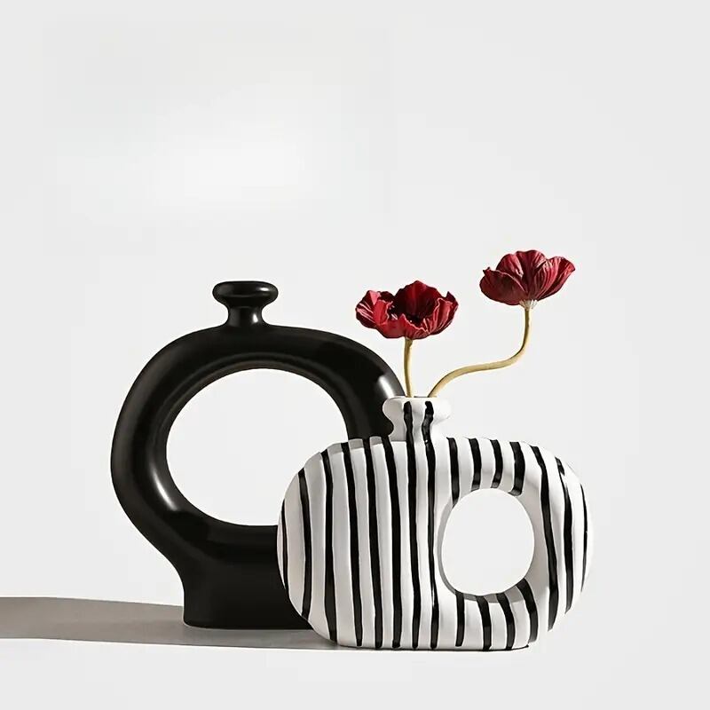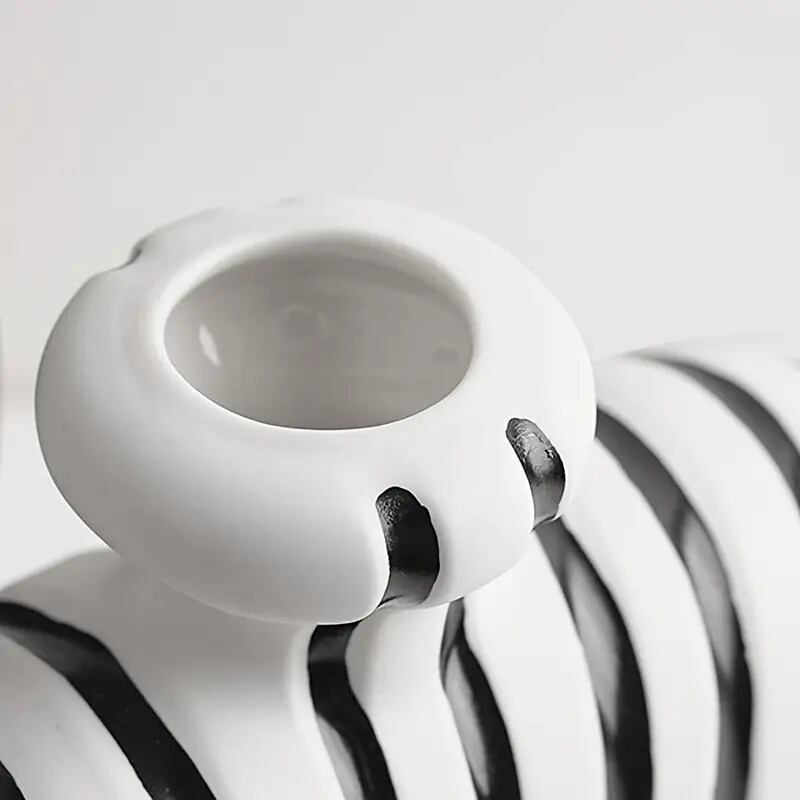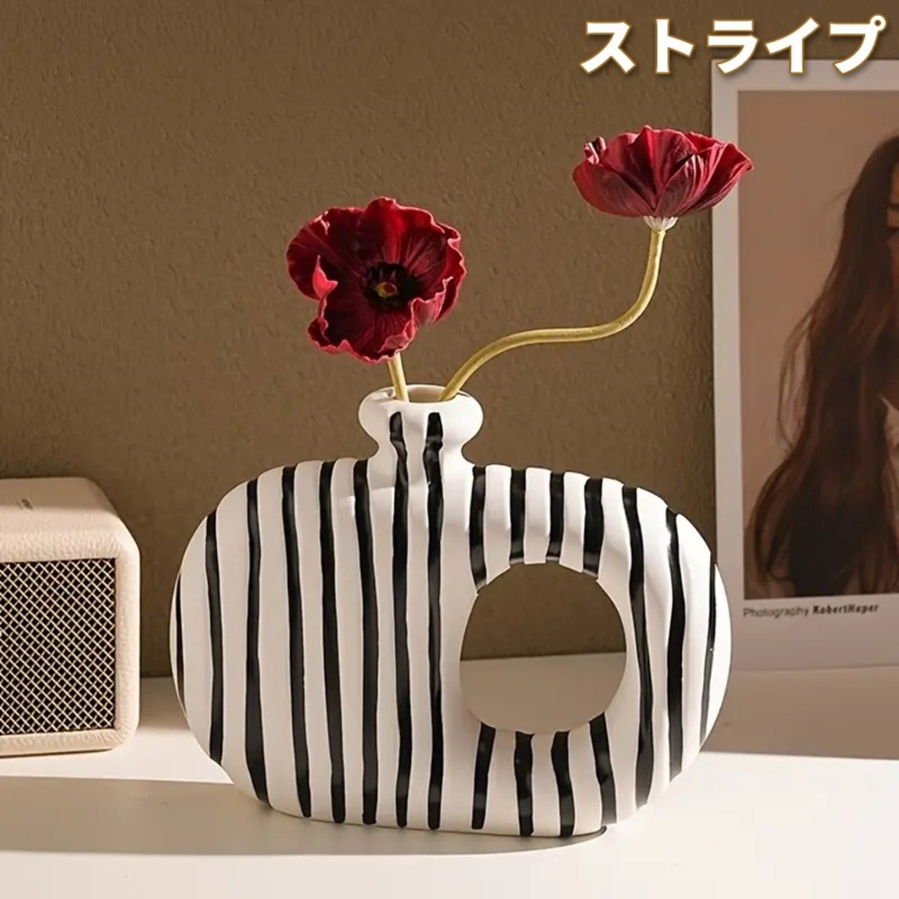 置物 オブジェ フラワーベース 花瓶 ドーナツ型 セラミック おしゃれ かわいい インテリア 北欧 ブラック ホワイト ストライプ 北欧風 リビングルーム ベッドルーム オフィス 書斎 モダン 雑貨 デザイン ギフト モダンアート風 シンプル デコレーション | Calm+(カームプラス) - 北欧風ナチュラルインテリア・モダン家具専門店