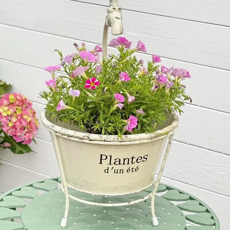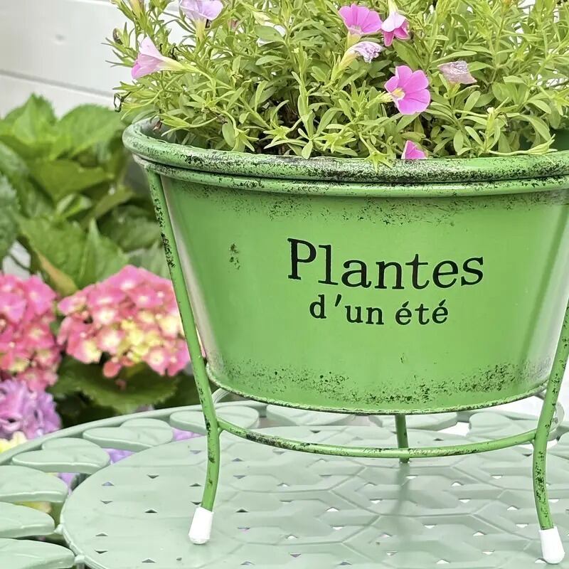 アンティーク風のラウンド型ポットは、ハイレッグスタンド付きで、バルコニーや屋外でのガーデニングをより魅力的に演出します。