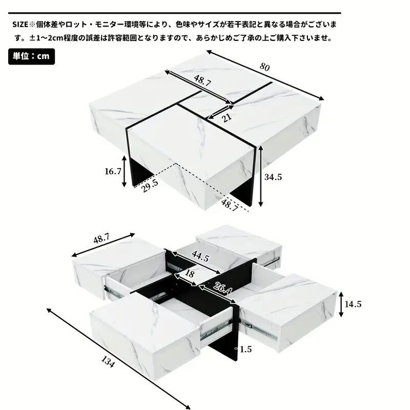 ・収納時:80×80×34.5cm(脚高さ16.7cm)、引き出し最大幅134cm