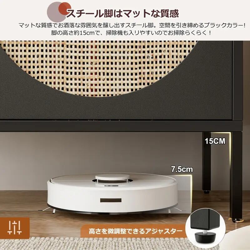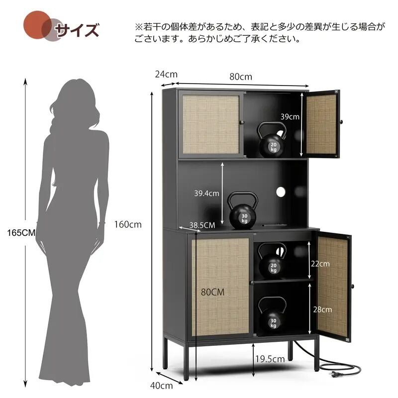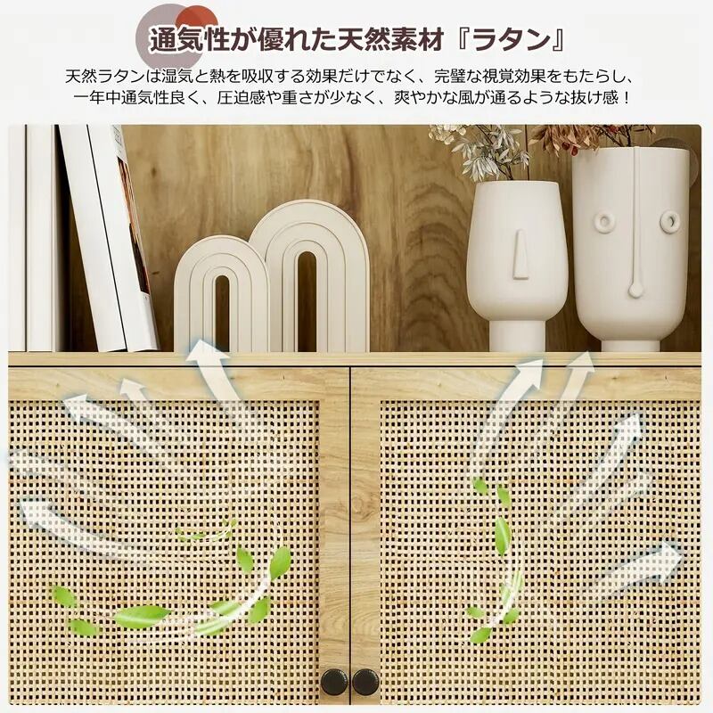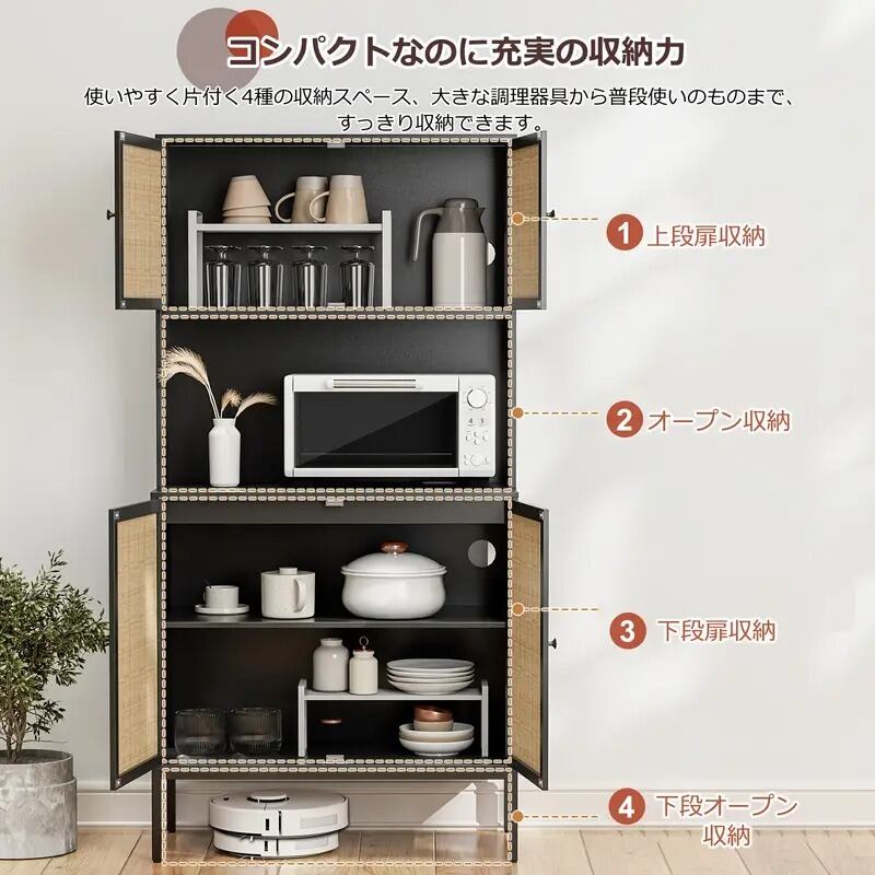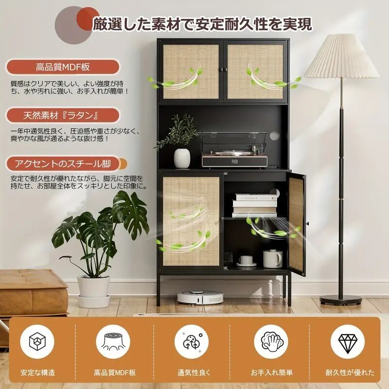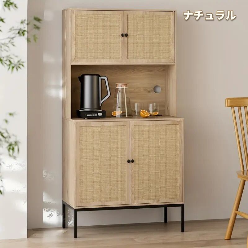 チェスト キャビネット キッチンキャビネット 食器棚 ベージュ 扉 レンジ台 サイドボード 収納 台所 おしゃれ かわいい インテリア 北欧 ラタン 4段 ラック 扉付き 大容量 コンセント USBポート 充電可 お手入れ簡単 通気性 ナチュラル ブラック