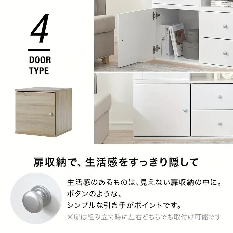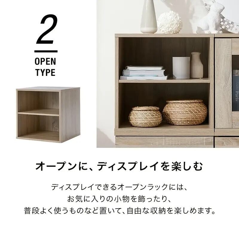 オープンラック、引き出し2段、窓付き扉、目隠し扉の4タイプが揃い、大容量の収納力を発揮。