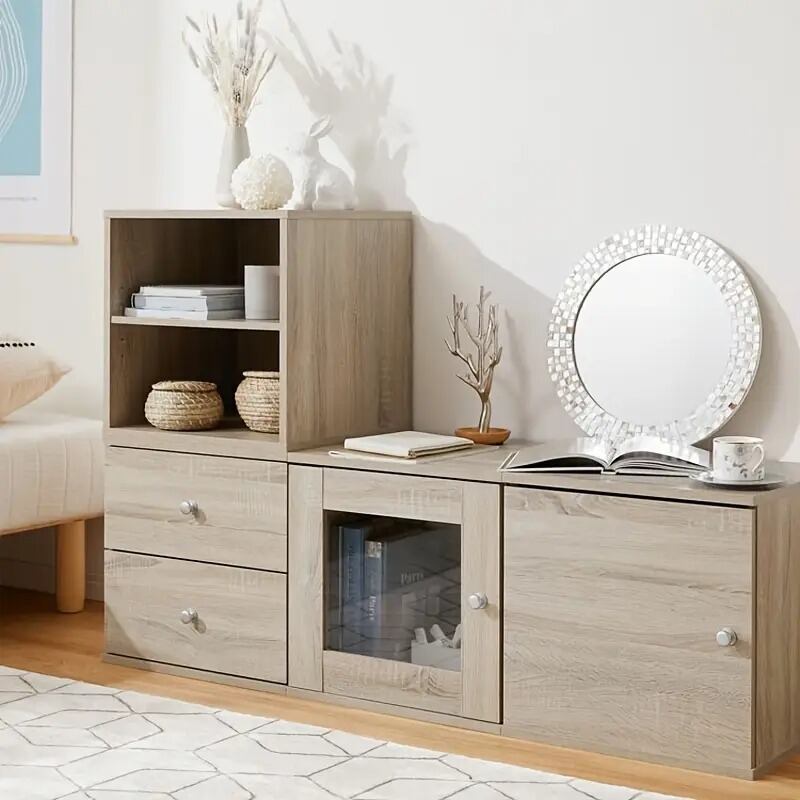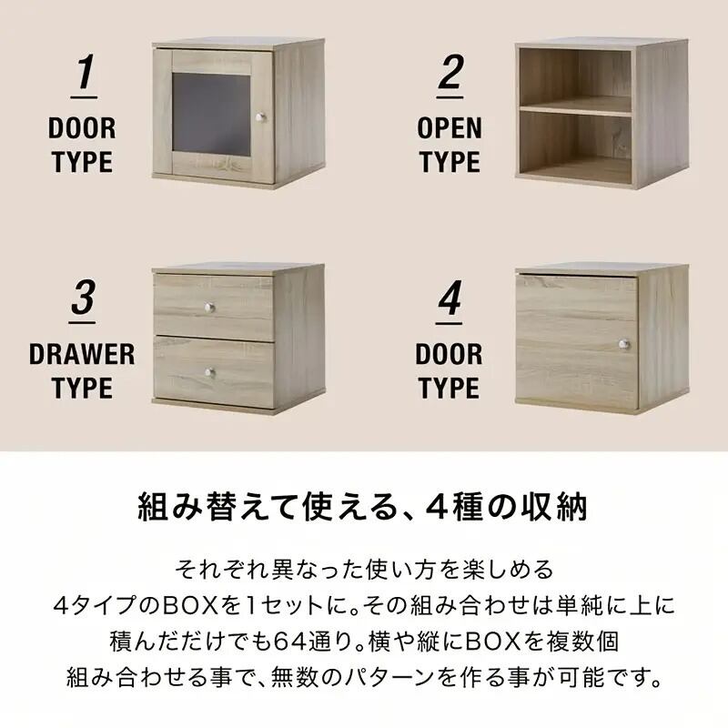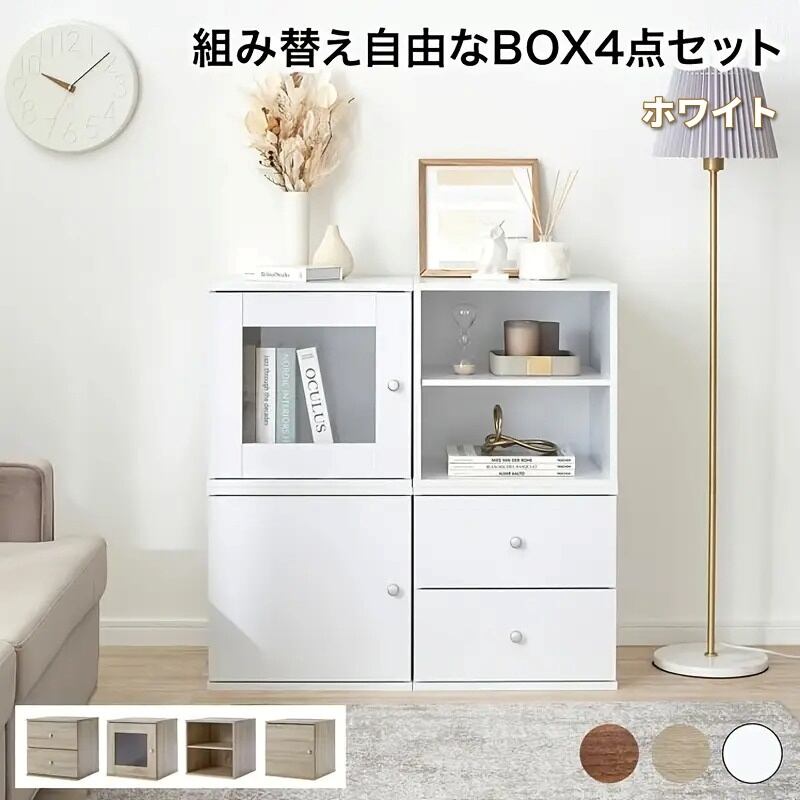 チェスト キャビネット 組み換え自由 レイアウト自由 ダークグレー マルチラック 収納ボックス 4点セット おしゃれ かわいい インテリア 北欧 4タイプ オープンラック 引き出し2段 窓付き扉 目隠し扉 大容量 シンプル リビング 寝室 オーク色 ホワイト | Calm+(カームプラス) - 北欧風ナチュラルインテリア・モダン家具専門店