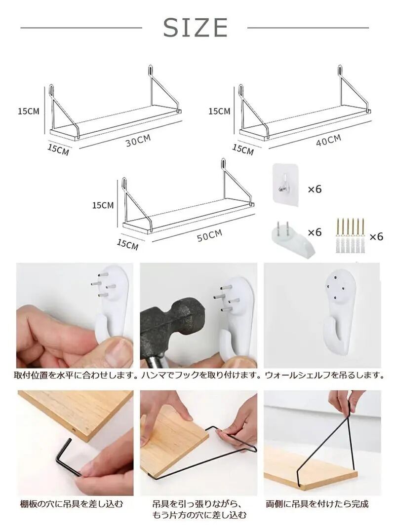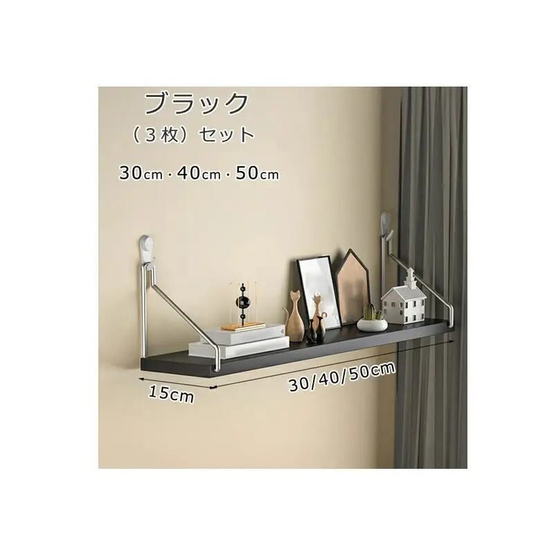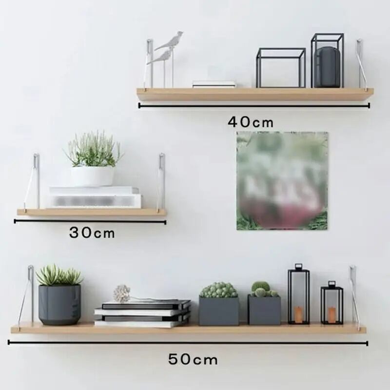 3枚セットのシェルフは、30cm、40cm、50cmの異なるサイズで、飾り棚としても壁面収納としても大活躍。