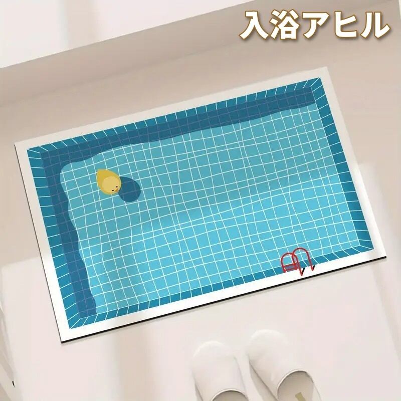 このバスマットは、プールモチーフのデザインが特徴で、アヒルや浮き輪のプリントが施されています。