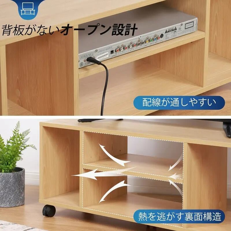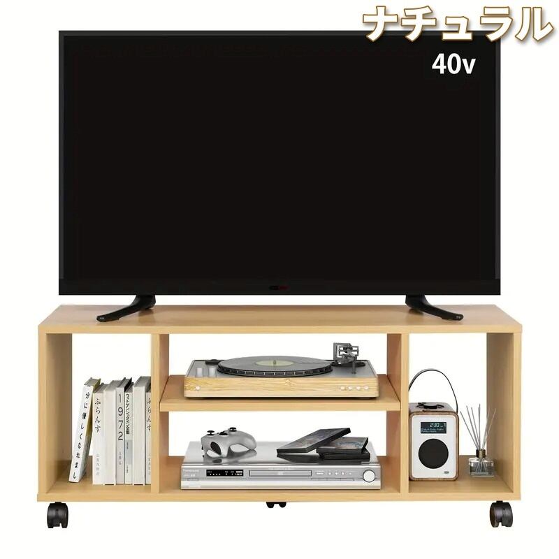 キャスター付きローボードは、幅90cmで40インチまでのテレビに対応し、ナチュラルなデザインがインテリアに調和します。