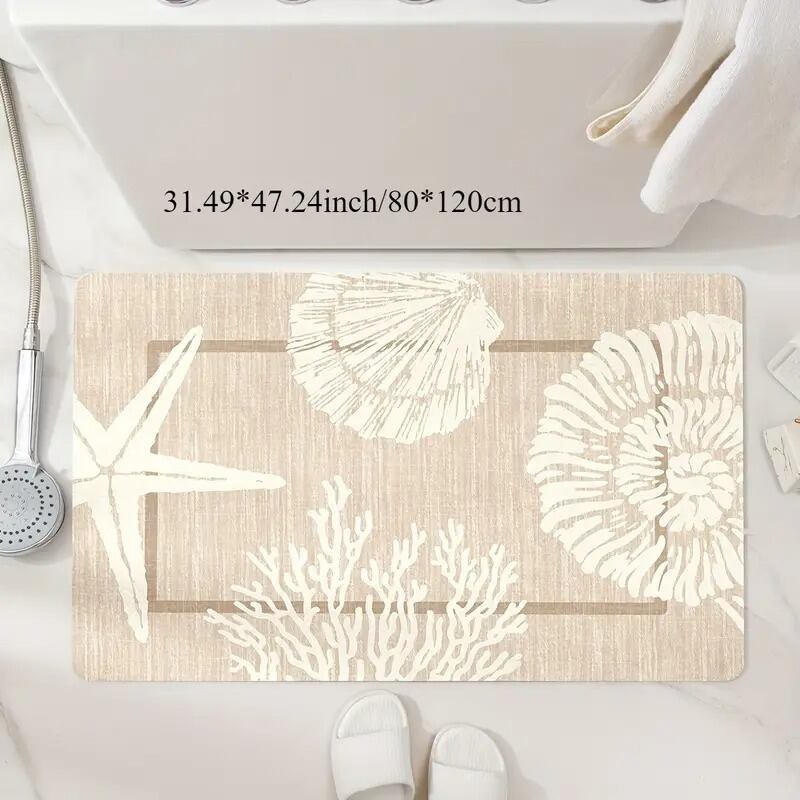 貝殻やヒトデ、珊瑚のデザインが施されたこのバスマットは、おしゃれでモダンなインテリアにぴったりです。