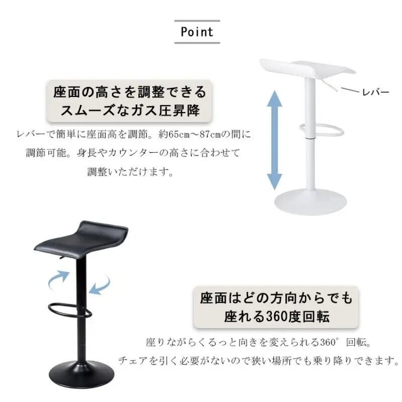 カウンターチェア 2脚セット 四角形 バーチェア おしゃれ シンプル モダン スタイリッシュ インテリア 北欧 昇降回転 高さ調節可能 フットレスト付き PUレザー 耐荷重90kg ブラック ホワイト 39×38×65〜87cm | Calm+(カームプラス) - 北欧風ナチュラルインテリア・モダン家具専門店