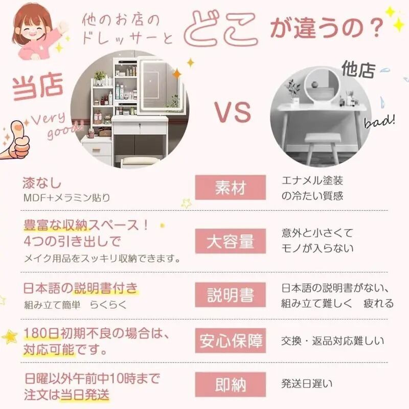 引き出し収納も充実しており、メイク道具やアクセサリーをすっきり整理できます。