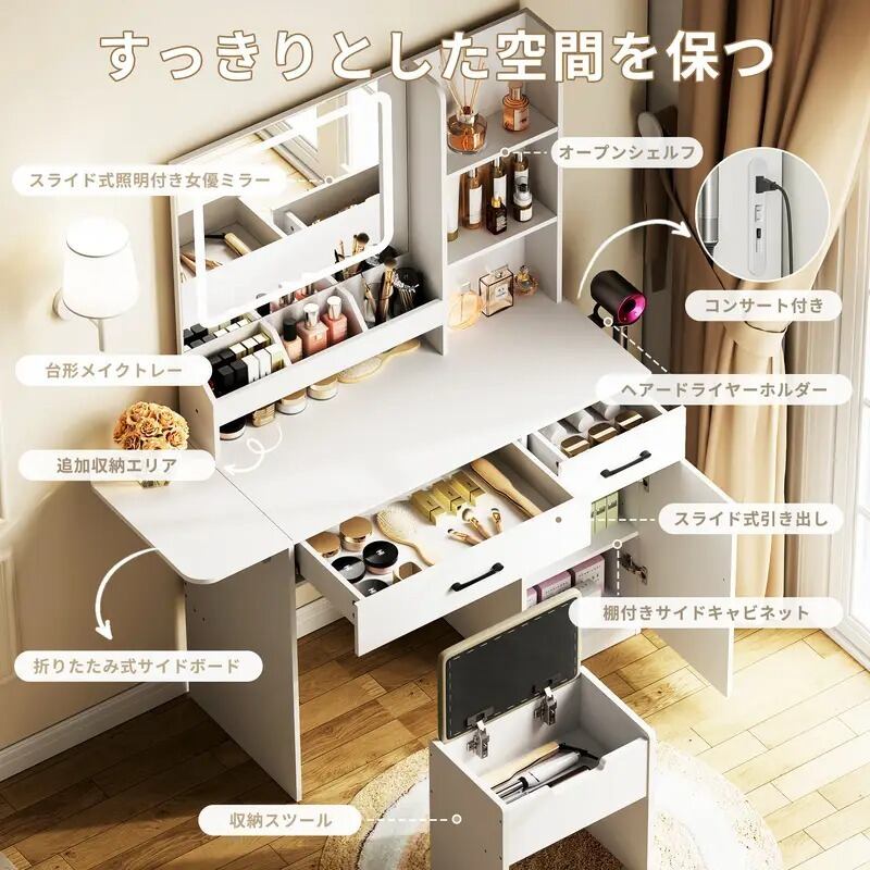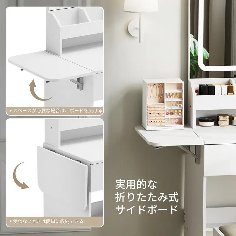 ヘアドライヤーホルダーや折りたたみサイドボードも備え、機能性も充実しています。