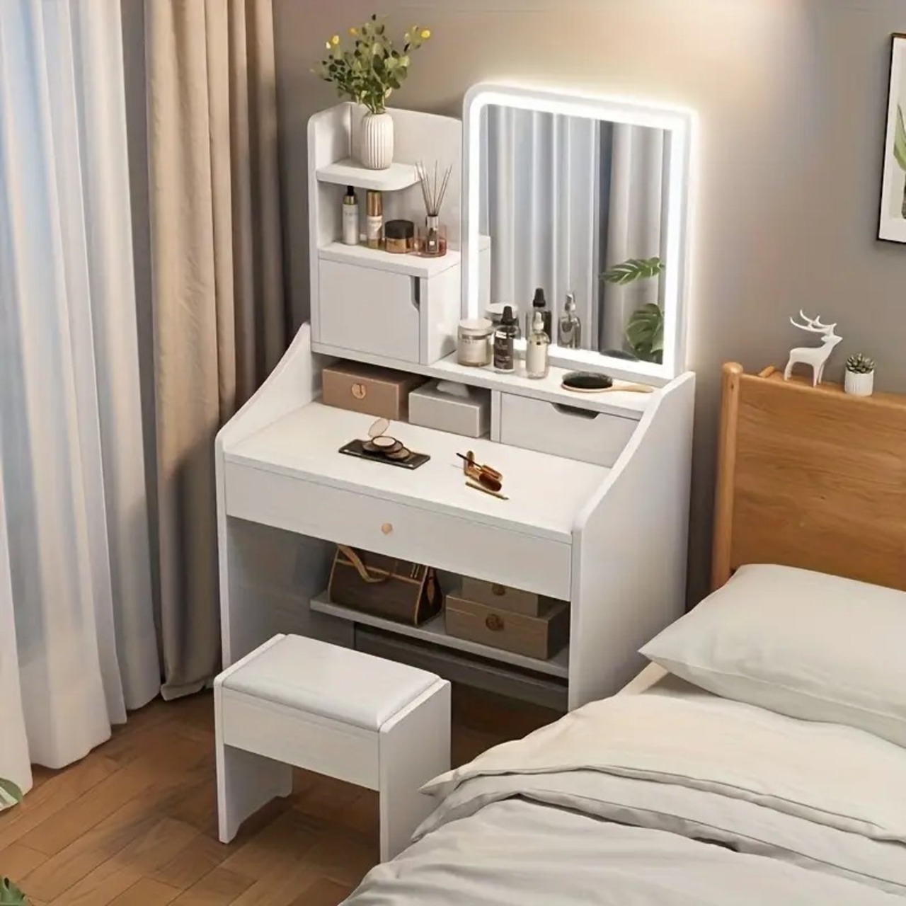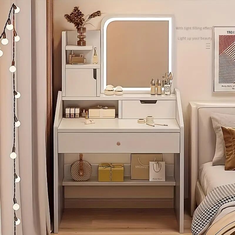 収納キャビネット付きで、化粧品やアクセサリーもすっきり整理整頓。