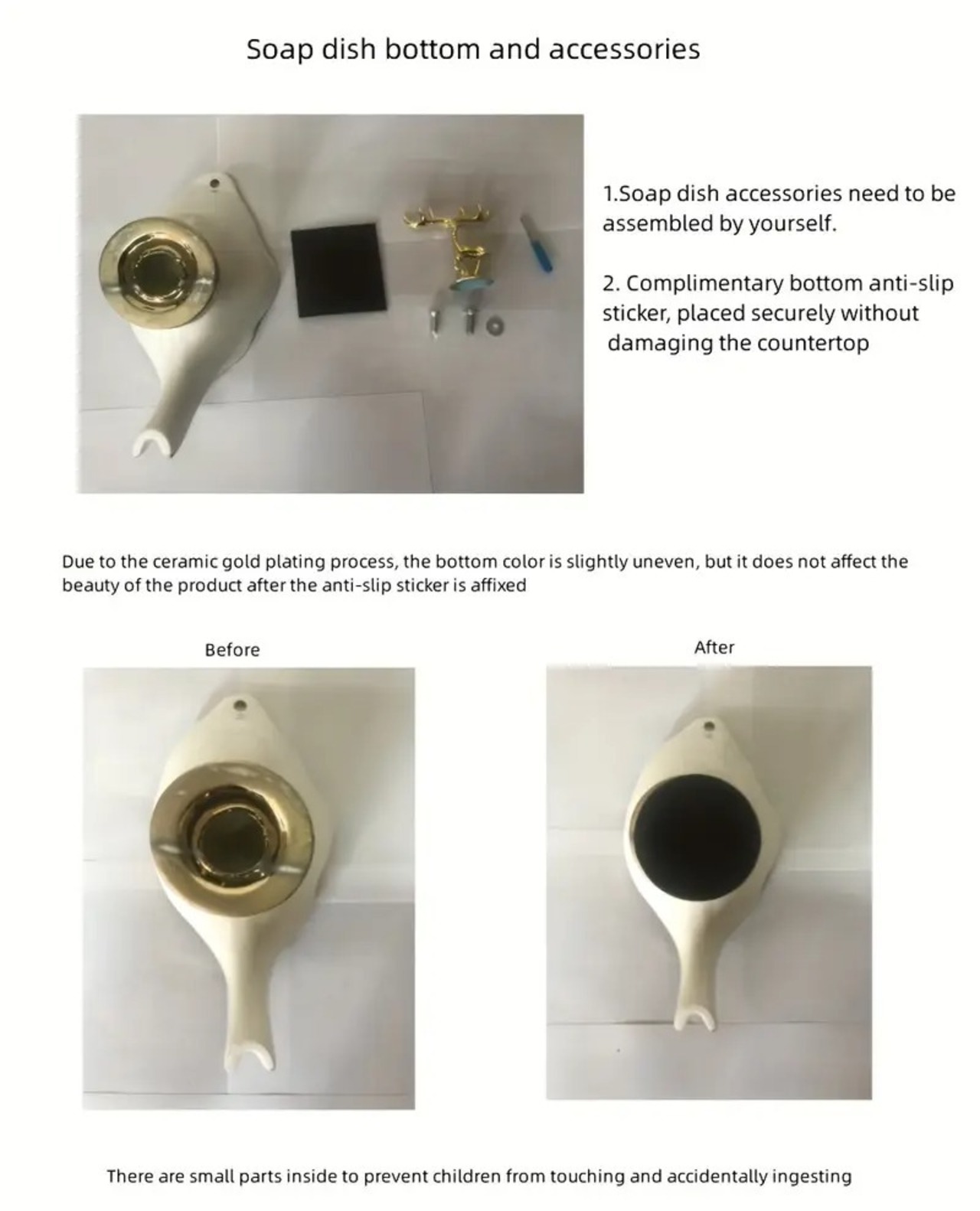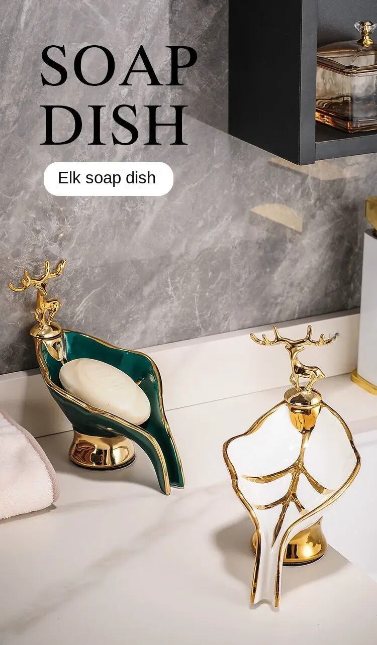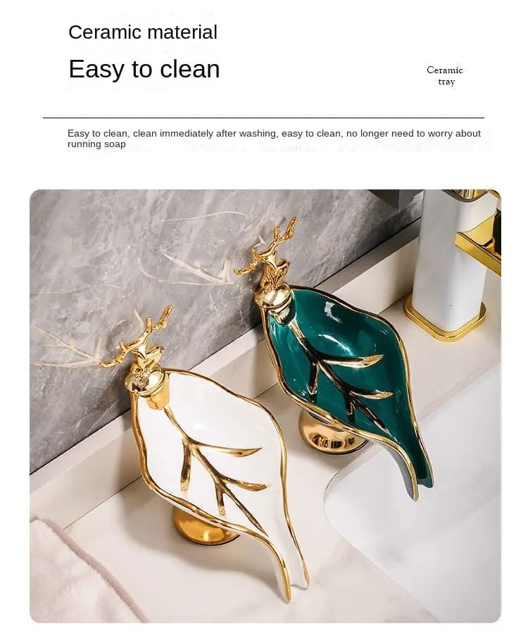 ソープディッシュ ソープホルダー 石鹸置き リーフ型 鹿 おしゃれ エレガント 高級感 モダン インテリア 北欧 水切り 排水 ゴールド装飾 ホワイト グリーン セラミック 10×19×15cm | Calm+(カームプラス) - 北欧風ナチュラルインテリア・モダン家具専門店