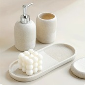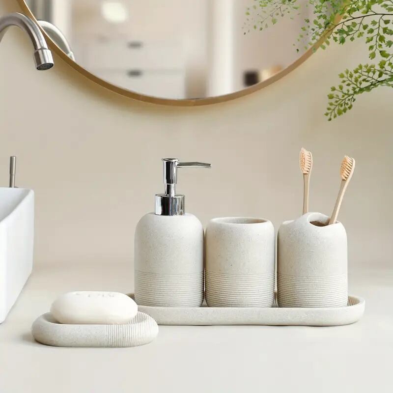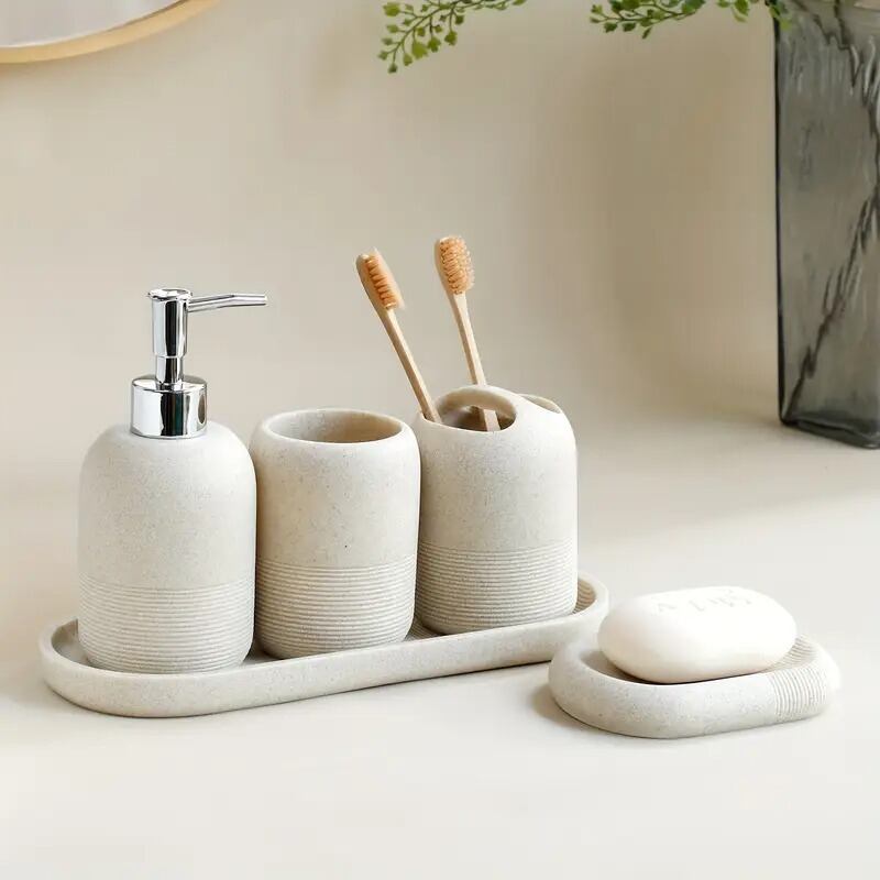 ソープディッシュ ソープホルダー 石鹸置き 洗面用具一式 5点セット シンプル ナチュラル おしゃれ モダン インテリア 北欧 ストーン風 無地 ディスペンサー 歯ブラシスタンド コップ トレイ 樹脂製 12.6×9.4×2cm 27.3×10.5×2cm | Calm+(カームプラス) - 北欧風ナチュラルインテリア・モダン家具専門店