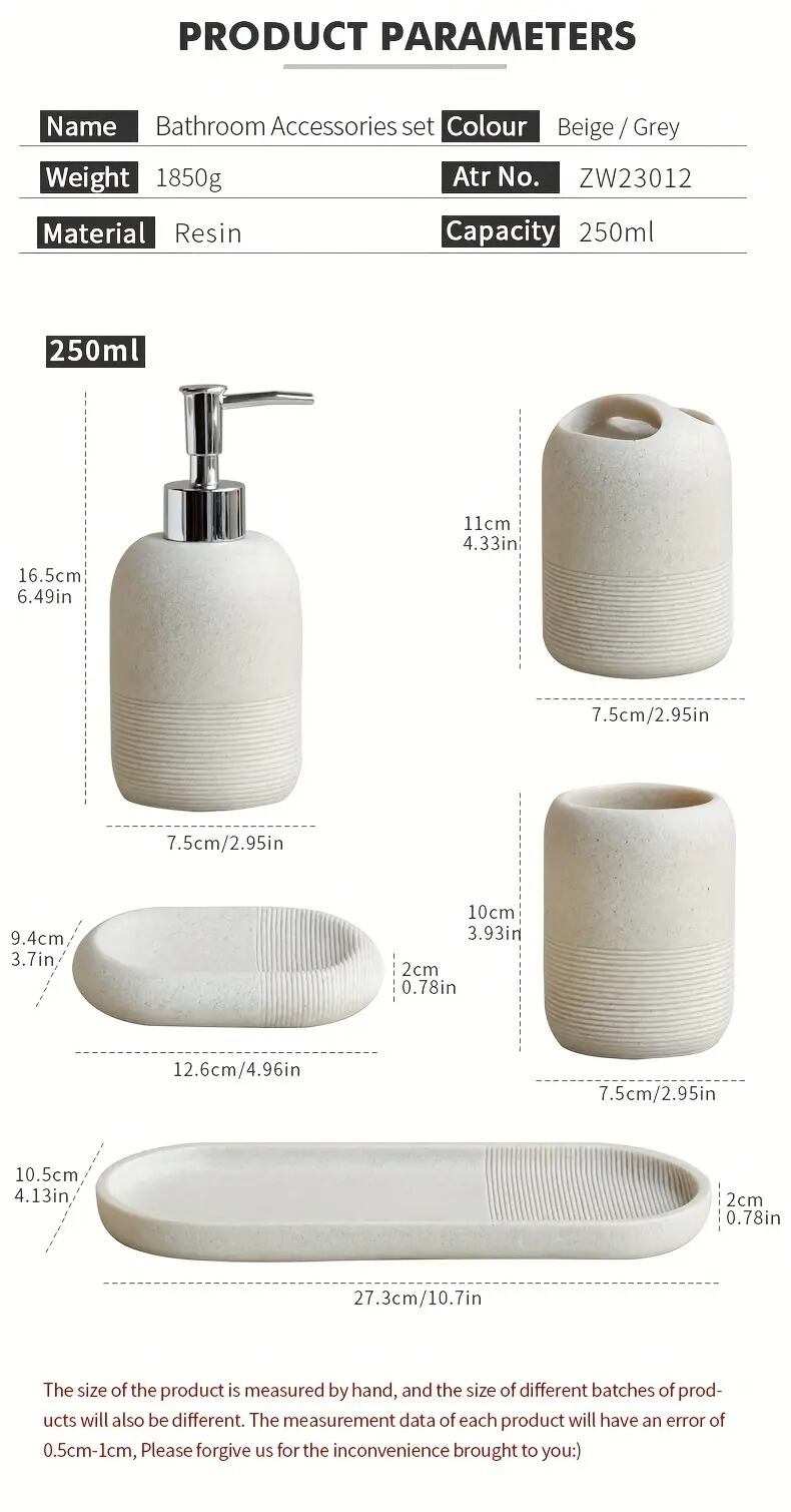・ディスペンサー:7.5×16.5cm、ソープディッシュ:12.6×9.4×2cm、歯ブラシスタンド:7.5×11cm、コップ:7.5×10cm、トレイ:27.3×10.5×2cm