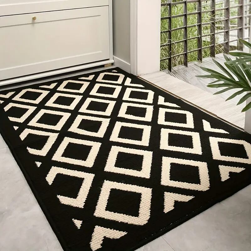 おしゃれなモノトーンの幾何学模様が特徴の屋外ドアマットです。