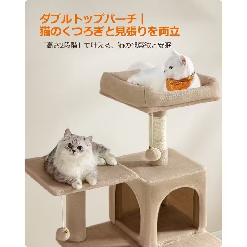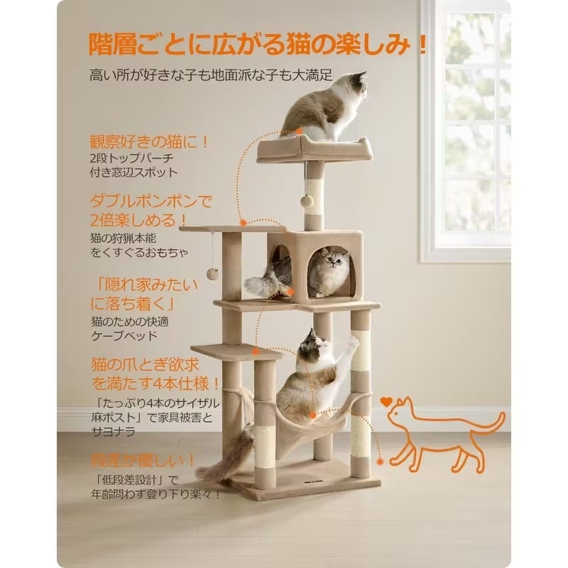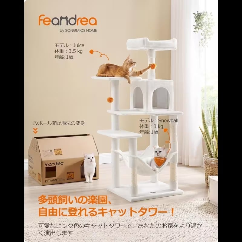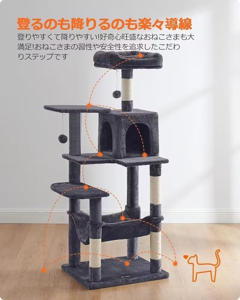 猫たちの楽園、スリムでおしゃれなキャットタワー登場!大型猫も安心して遊べるハンモック付きの猫タワーです。