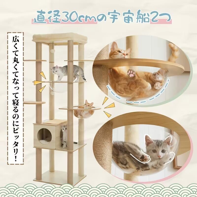 見晴らし台や宇宙船のような隠れ家があり、猫たちの好奇心をくすぐります。