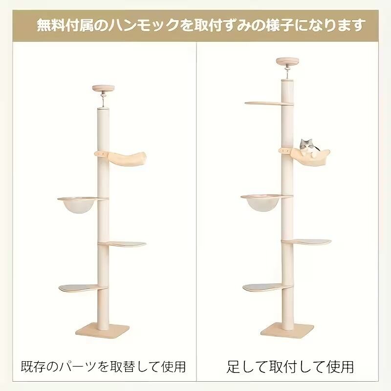 キャットタワー 猫タワー 大型猫用 突っ張り式 ハンモック付き シンプル おしゃれ 可愛い インテリア 北欧 多頭飼い 宇宙船 爪とぎ 運動不足解消 安定 調節可能 スリム 省スペース ホワイト ラバーウッド コットン紐 高さ195〜267cm | Calm+(カームプラス) - 北欧風ナチュラルインテリア・モダン家具専門店