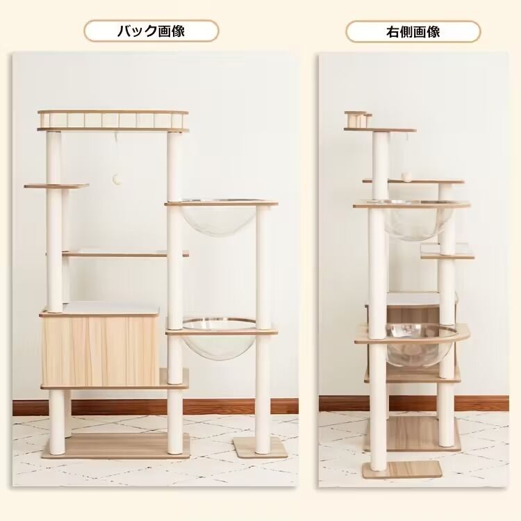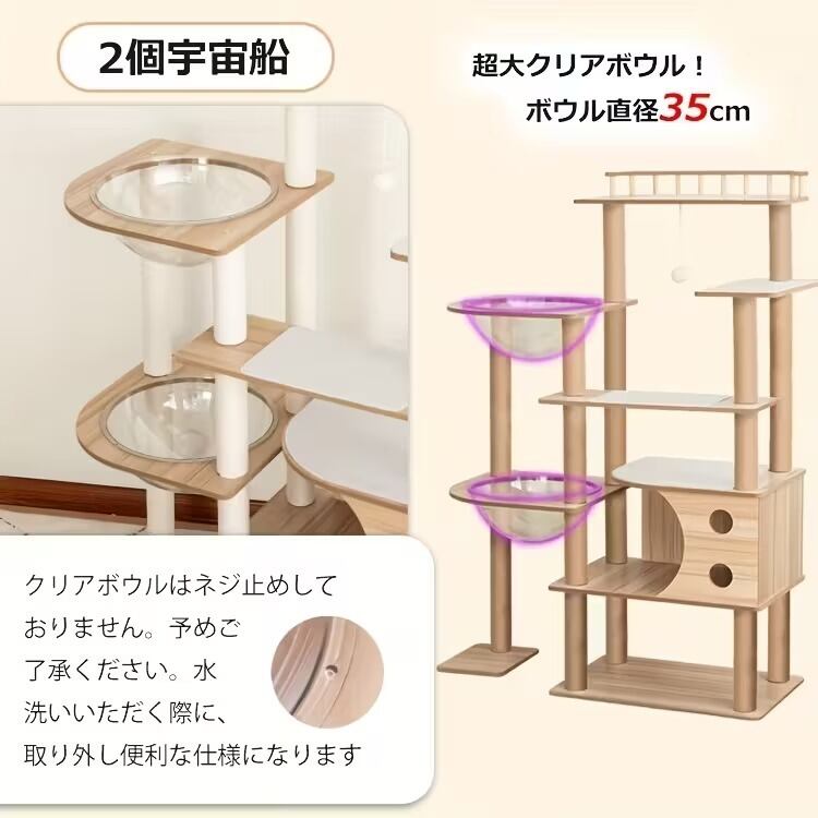 キャットタワー 猫タワー 木製 大型猫用 特大クリアボウル ナチュラル シンプル おしゃれ 可愛い インテリア 北欧 据え置き 宇宙船2個 多頭飼い 隠れ家 展望台 爪とぎ 運動不足解消 安定 スリム ホワイト ブラウン 高さ141cm | Calm+(カームプラス) - 北欧風ナチュラルインテリア・モダン家具専門店