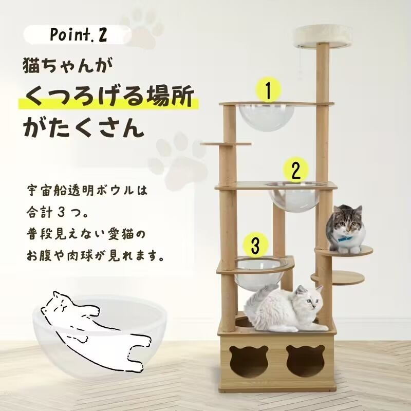 キャットタワー 猫タワー 木製 大型猫用 宇宙船ボウル3個 ナチュラル シンプル おしゃれ 可愛い インテリア 北欧 据え置き 多頭飼い 大きい隠れ家 展望台 おもちゃ 爪とぎ 運動不足解消 安定 スリム 省スペース 60×39.5×175cm | Calm+(カームプラス) - 北欧風ナチュラルインテリア・モダン家具専門店
