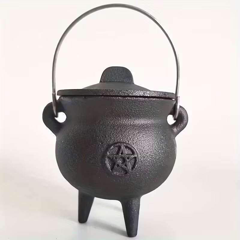 置物 オブジェ ハロウィン雑貨 装飾 魔女の大釜 ユニーク 神秘的 インテリア 北欧 香炉 お香 キャンドルホルダー 五芒星 月 蓋付き 持ち手 脚付き ブラック 鋳鉄製 7.5×10cm | Calm+(カームプラス) - 北欧風ナチュラルインテリア・モダン家具専門店