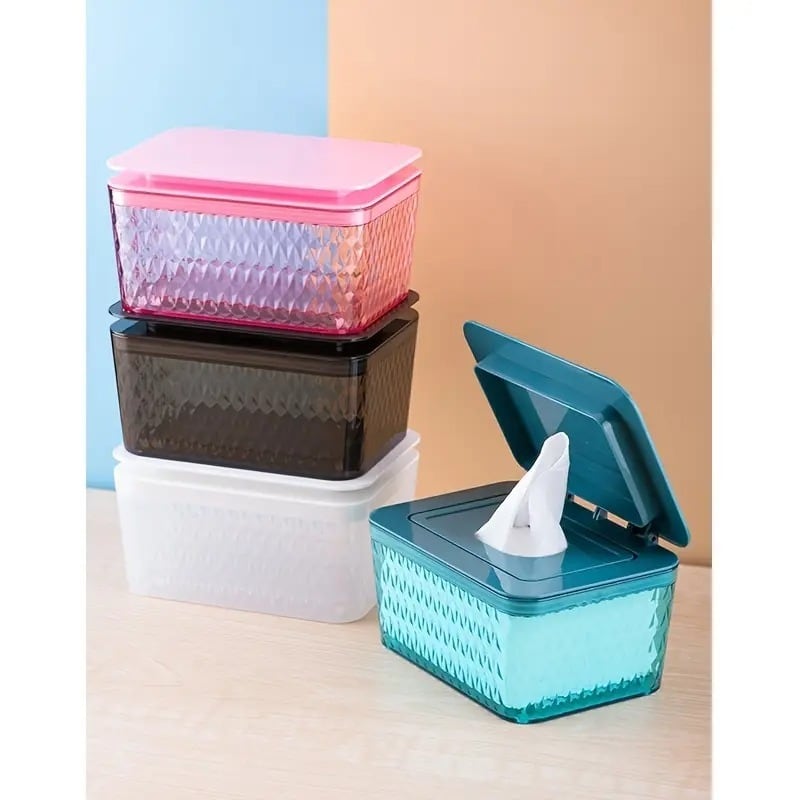 この半透明でクリアなデザインのティッシュホルダーは、蓋付きで中身が見えるため、使いやすさ抜群です。