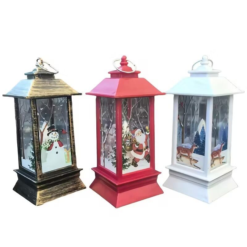 サンタクロースや雪だるま、トナカイが描かれたランタンは、クリスマスの雰囲気を一層引き立てる装飾品です。