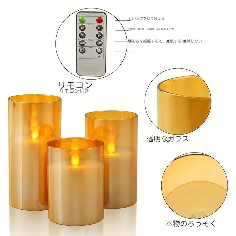 LEDキャンドルライト 3点セット リモコン付き クリスマス雑貨 無炎ろうそく リアル きれい おしゃれ モダン インテリア 北欧 タイマー機能 サイズ違い ゴールド系 10cm 12cm 14cm
