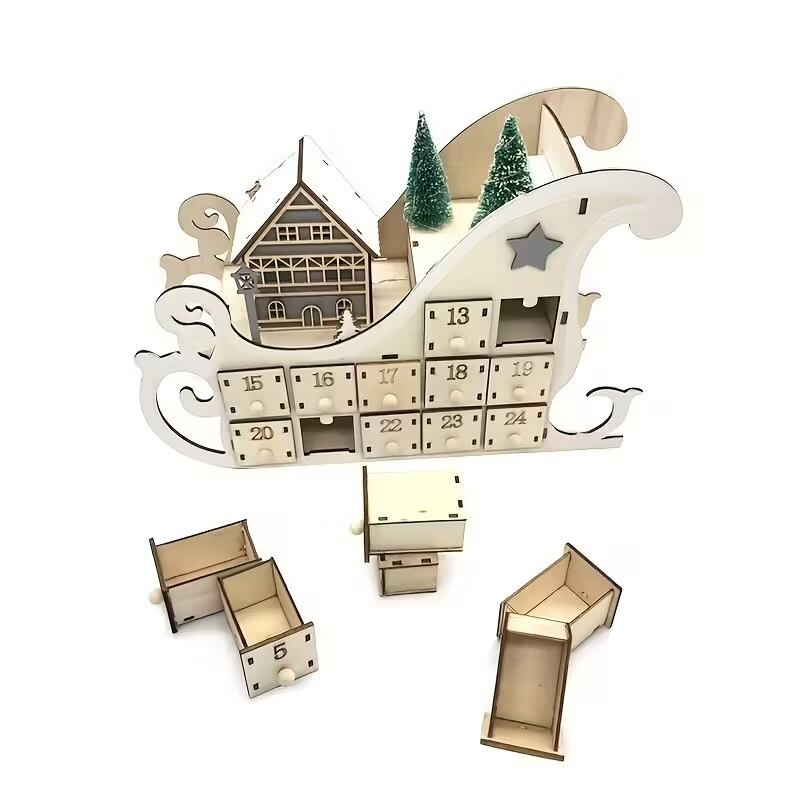 アドベントカレンダー クリスマス雑貨 そり型 ライト付き ジオラマ 可愛い 綺麗 おしゃれ インテリア 北欧 家 ツリー 24日間 木製 28.5×8×20cm