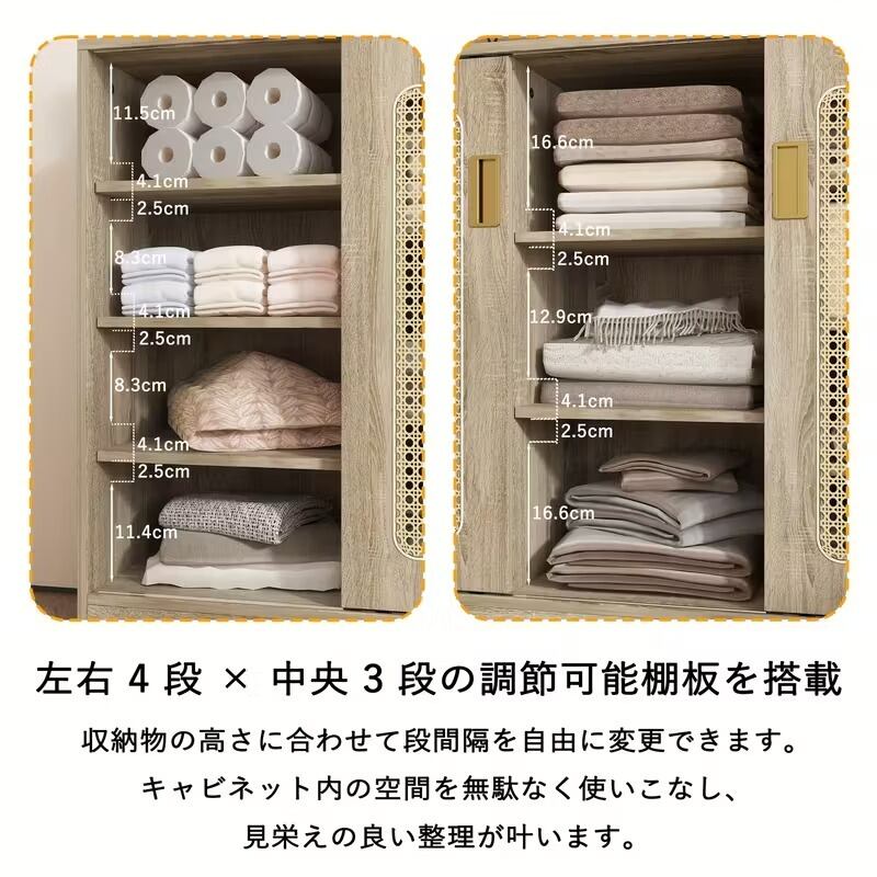 チェスト キャビネット ラタンデザイン 木目調 引き戸式 ナチュラル シンプル おしゃれ 可愛い インテリア 北欧 省スペース オープンラック 棚番調節可 スライドドア レイアウト自由 通気性 籐 木質パネル 90×30×70.2cm