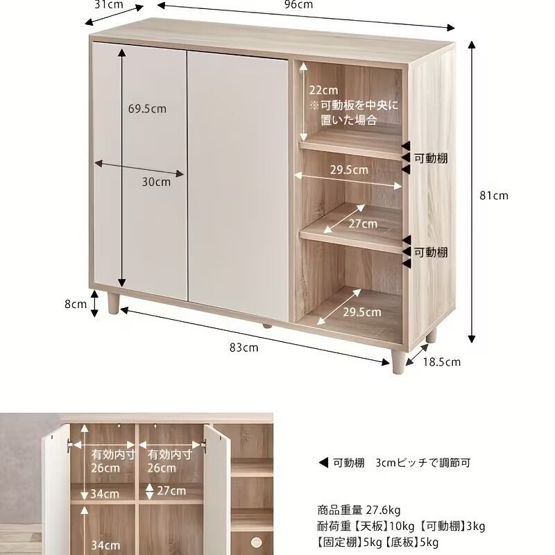 チェスト キャビネット ツートンカラー 木目調 アイボリー ナチュラル おしゃれ シンプル 可愛い インテリア 北欧 収納 マルチラック 大容量 省スペース 扉付き オープン棚 可動式 トップシェルフ ルーター配線穴付き 木質パネル 96×31×81cm