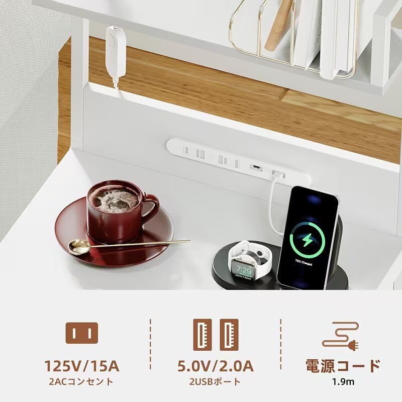 さらに、コンセント2箇所とUSBポート2個を備えており、電子機器の充電も便利。
