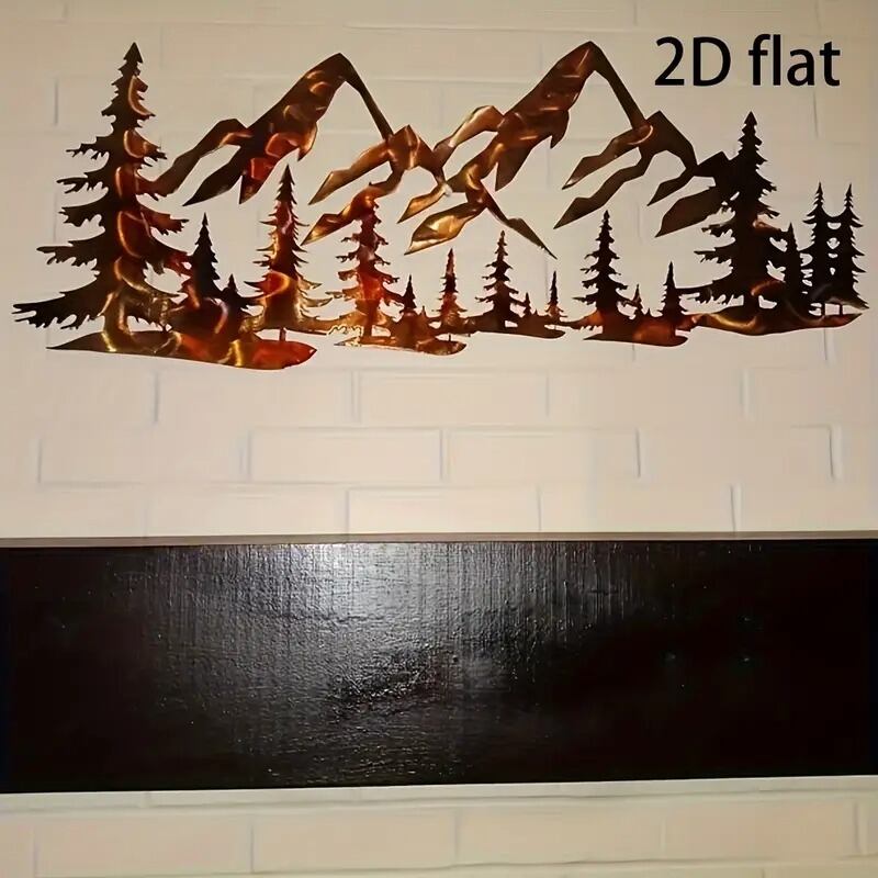 このウォールアートは、2Dフラットデザインで木と山の風景を描いたメタル製のアートパネルです。
