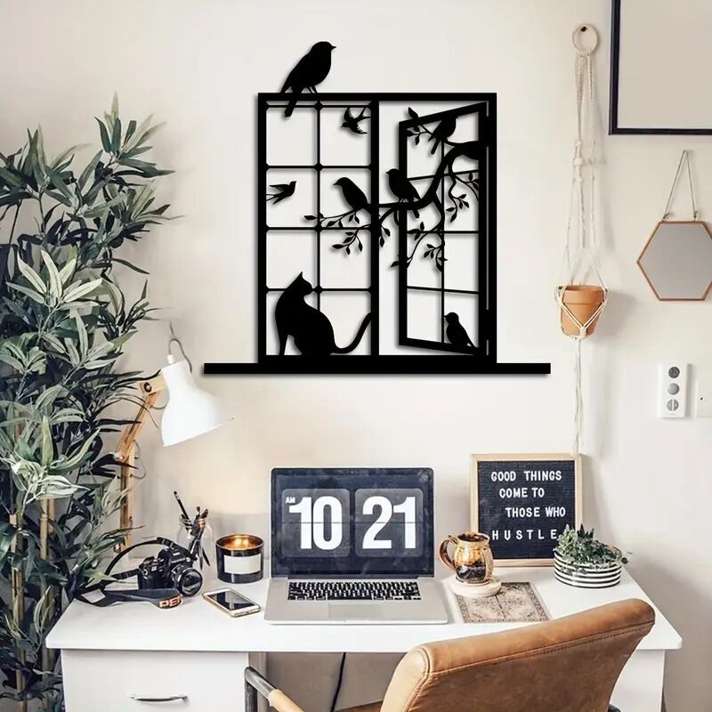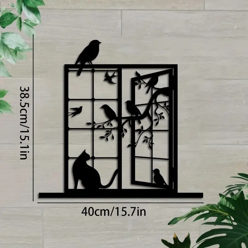 鉄素材で作られたこのアートパネルは、鳥と猫が織りなすかわいいシーンを描き出し、壁掛けや壁飾りとしても魅力的。