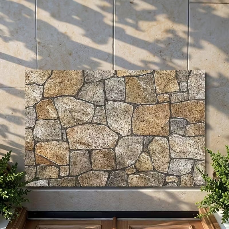 石畳風のデザインが魅力の屋外ドアマットで、玄関をナチュラルでスタイリッシュに演出します。