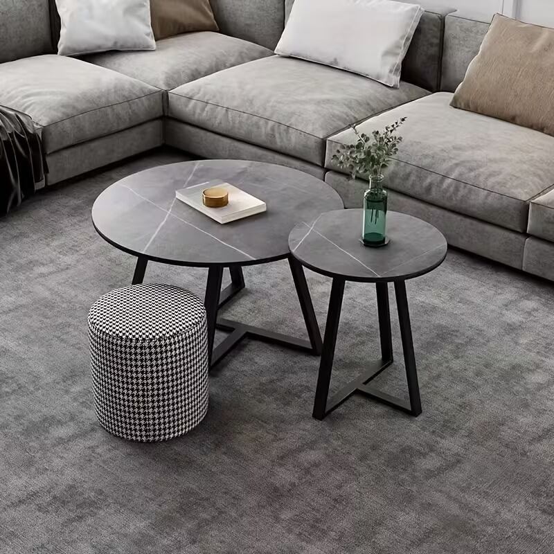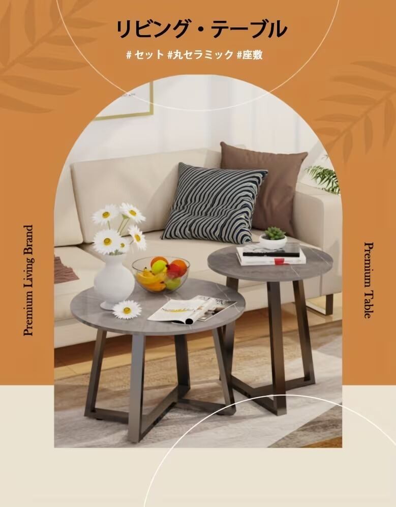 ローテーブル コーヒーテーブル 大理石風 円形 2点セット おしゃれ モダン かっこいい 美しい 高級感 重厚感 インテリア 北欧 ストーン調 センターテーブル サイドテーブル 分離型 高さ違い 大小 グレー系 セラミック 鉄 80×40cm 45×50cm