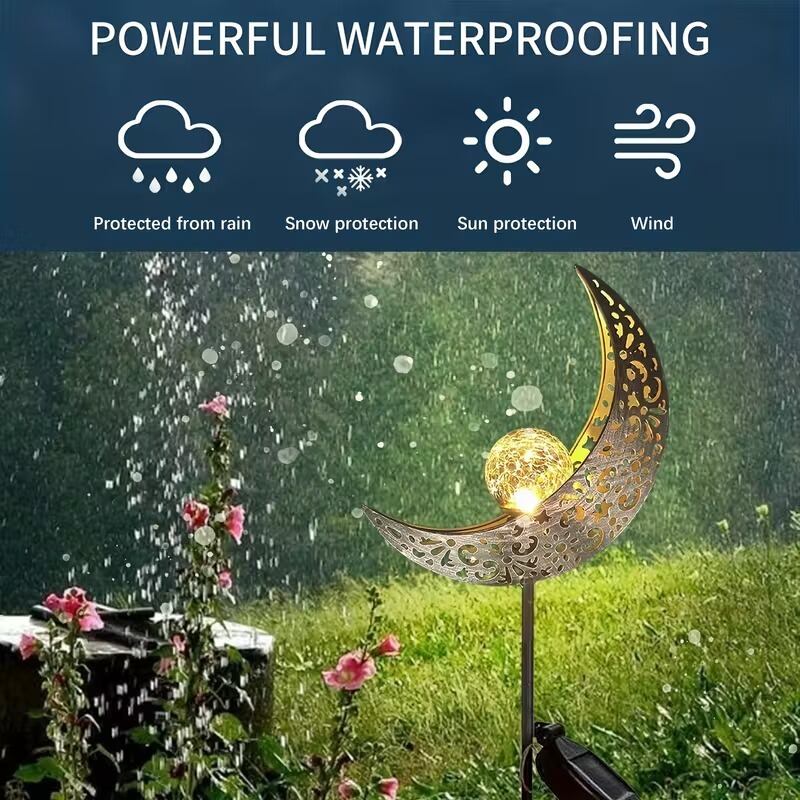 ガーデンライト 三日月 月型 ランプ 透かし柄 おしゃれ 幻想的 美しい 可愛い インテリア 北欧 ソーラー充電 屋外 庭 花壇 ガーデニング オブジェ ピンタイプ 光る球体 間接照明 自動点灯 太陽光発電 防水 IP65 金属 ガラス 20×87cm