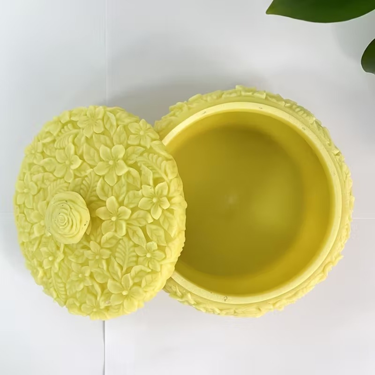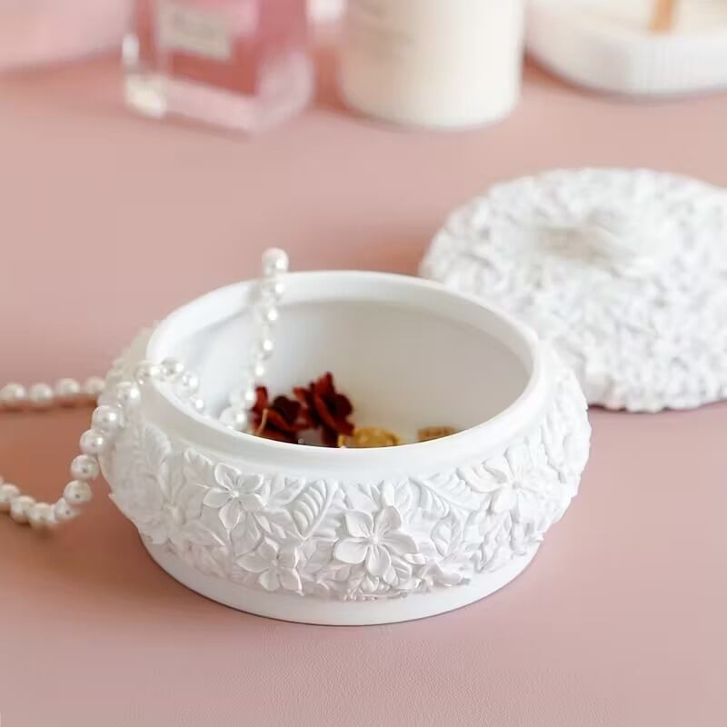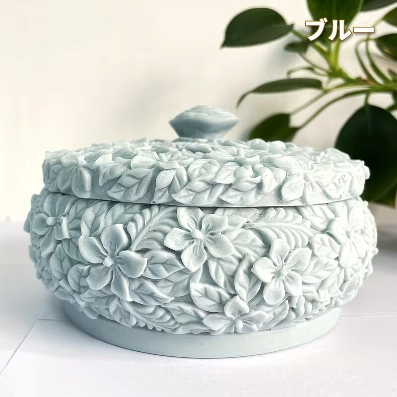小物入れ ジュエリーボックス 花柄 アクセサリーケース 石膏風 おしゃれ エレガント 綺麗 可愛い インテリア 北欧 収納 省スペース 蓋付き 立体模様 ラウンド型 ポット パステルカラー ホワイト イエロー ブルー グリーン ピンク 樹脂 15×8cm