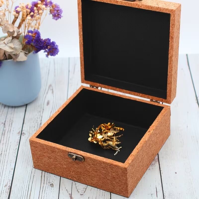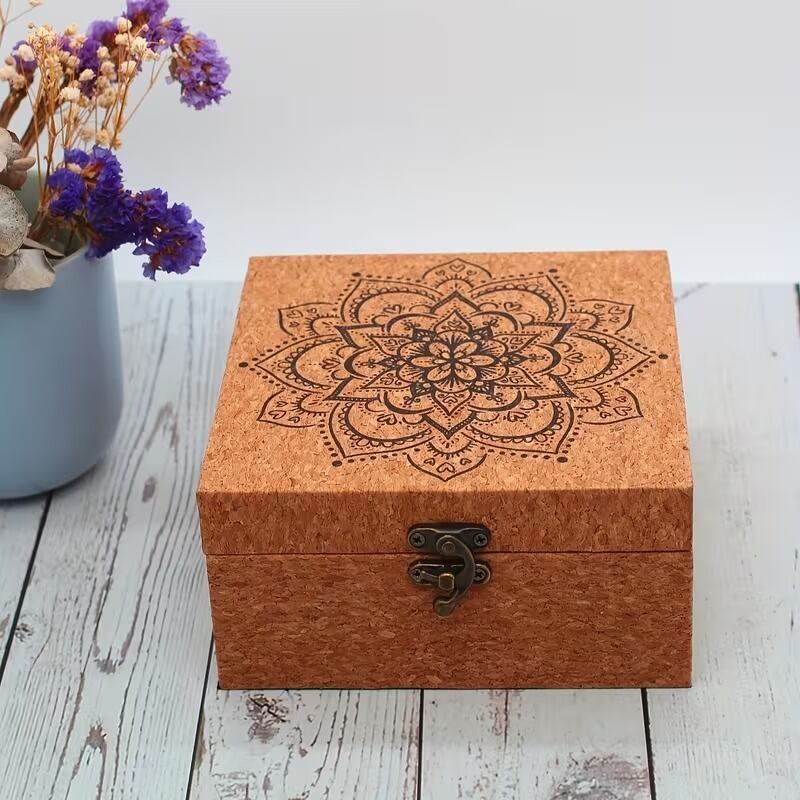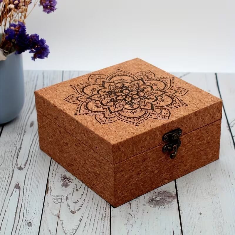 小物入れ マンダラ柄 蓮の花 ジュエリーボックス コルク調 おしゃれ 綺麗 可愛い インテリア 北欧 収納 卓上 蓋付き フラップ式 正方形 アクセサリーケース ゴールド金具 ヴィンテージ風 木製 15×15×8cm
