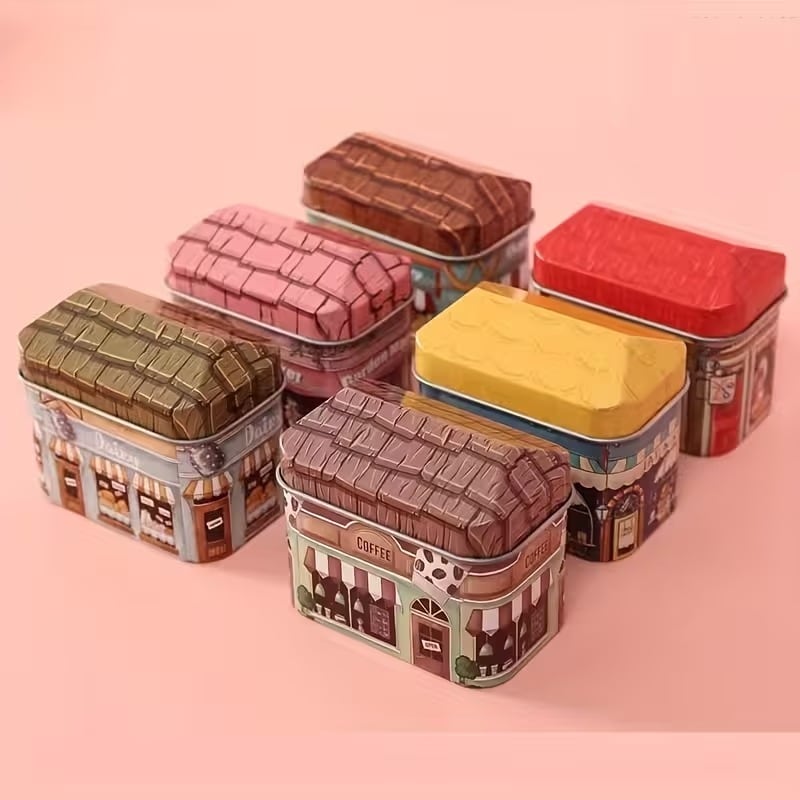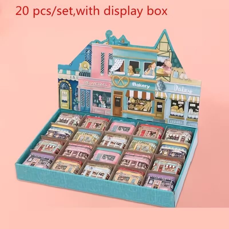 小物入れ ショップ柄 20個セット 手書き風 ヴィンテージ調 おしゃれ ナチュラル 可愛い インテリア 北欧 収納 卓上 アソート 蓋付き 三角屋根 スクエア缶 金属製 6.5×4×5.5cm