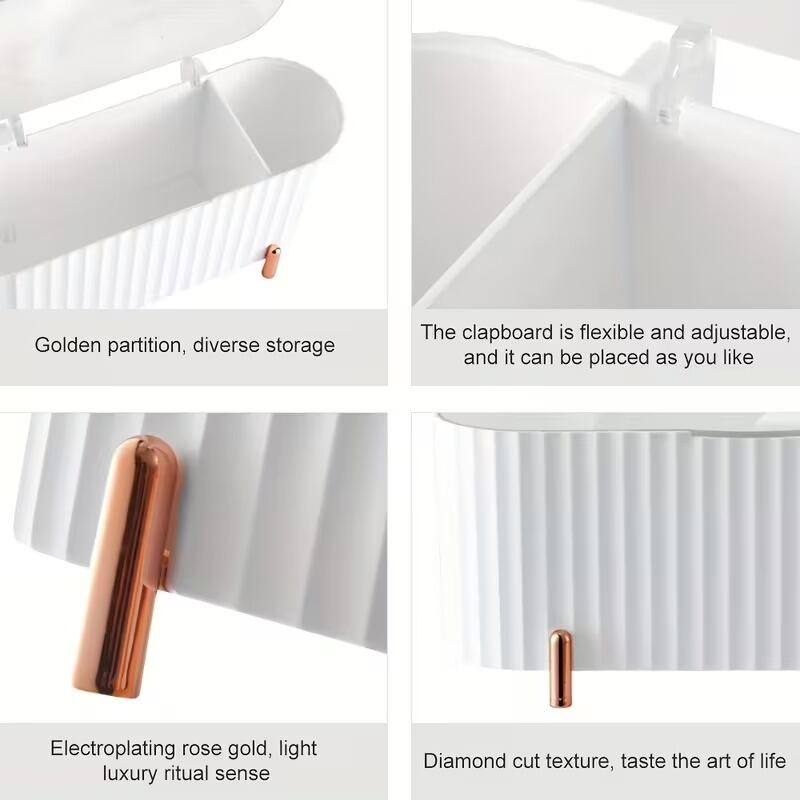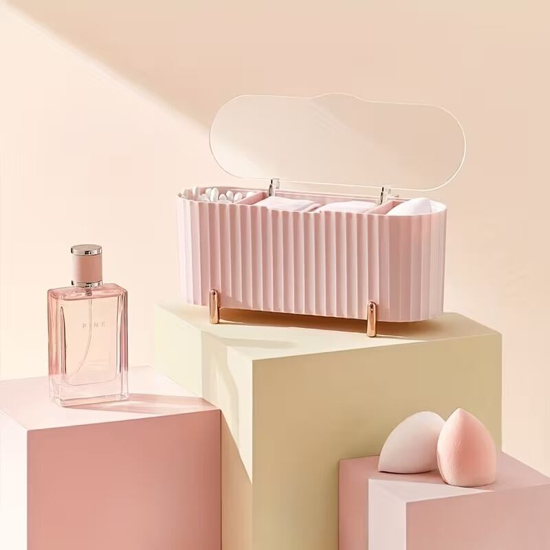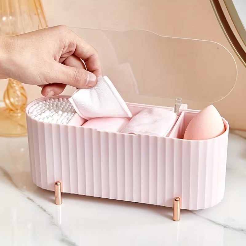 メイク用品収納にぴったりのこのボックスは、透明蓋が付いているので中身が一目でわかり、忙しい朝でもスムーズにメイクを楽しめます。