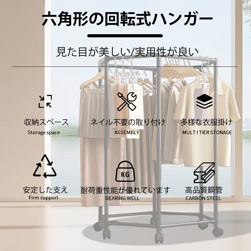 ハンガーラック 室内物干し 360°回転 洋服掛け 六角形 おしゃれ モダン シンプル インテリア 北欧 衣類収納 キャスター付き 部屋干し 省スペース パイプハンガー ブラック 鉄製 70×36×120cm