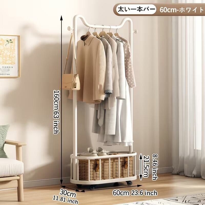 ハンガーラック 猫耳デザイン バスケット棚付き 両サイドフック 洋服掛け かわいい おしゃれ モダン インテリア 北欧 衣類収納 キャスター付き 省スペース 多機能 パイプハンガー 耐久性 組み立て簡単 アイボリー系 鋼製 60×30×160cm