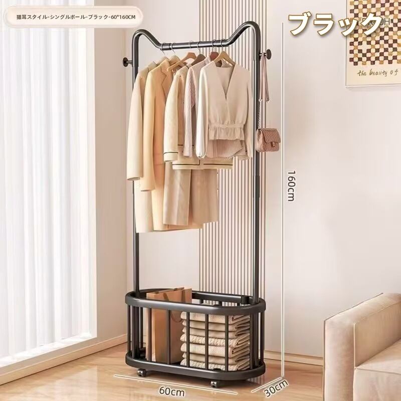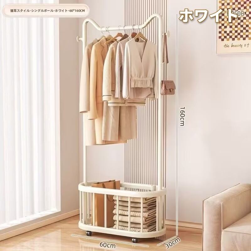 ハンガーラック 猫耳デザイン バスケット棚付き 両サイドフック 洋服掛け かわいい おしゃれ モダン インテリア 北欧 衣類収納 キャスター付き 省スペース 多機能 パイプハンガー ホワイト ブラック 金属製 60×30×160cm