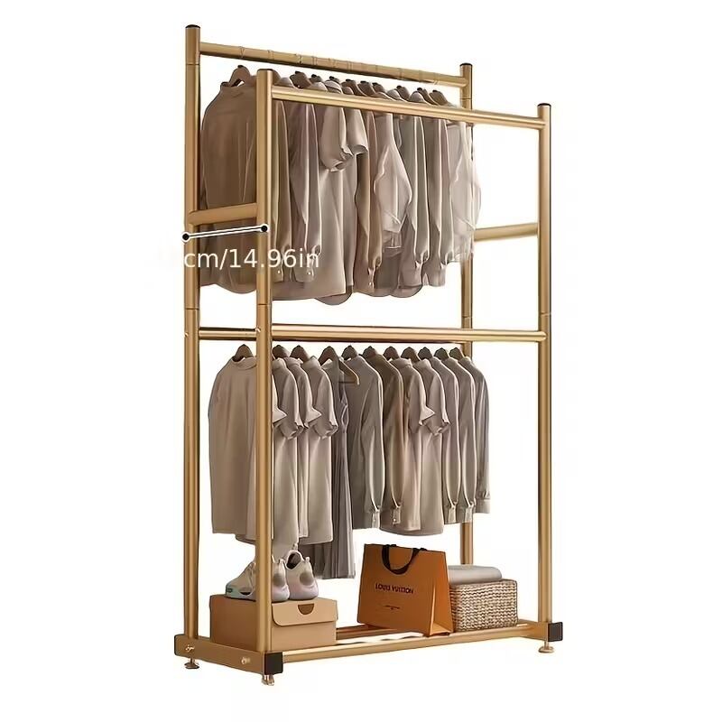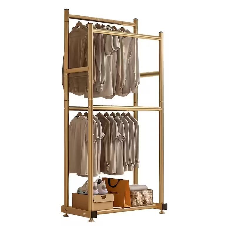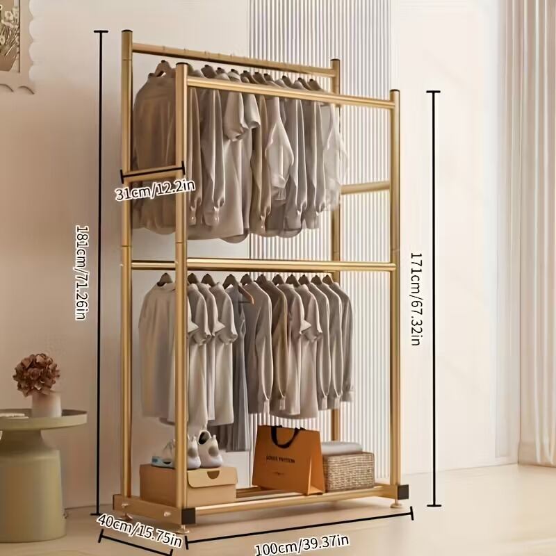 ハンガーラック 自立式 ダブルロッド 棚付き シンプル おしゃれ かわいい ナチュラル アンティーク風 ミニマル インテリア 北欧 コートラック 衣類ハンガー 収納ラック 室内干し リビング クローゼット 金属製 ゴールド100×40×181cm