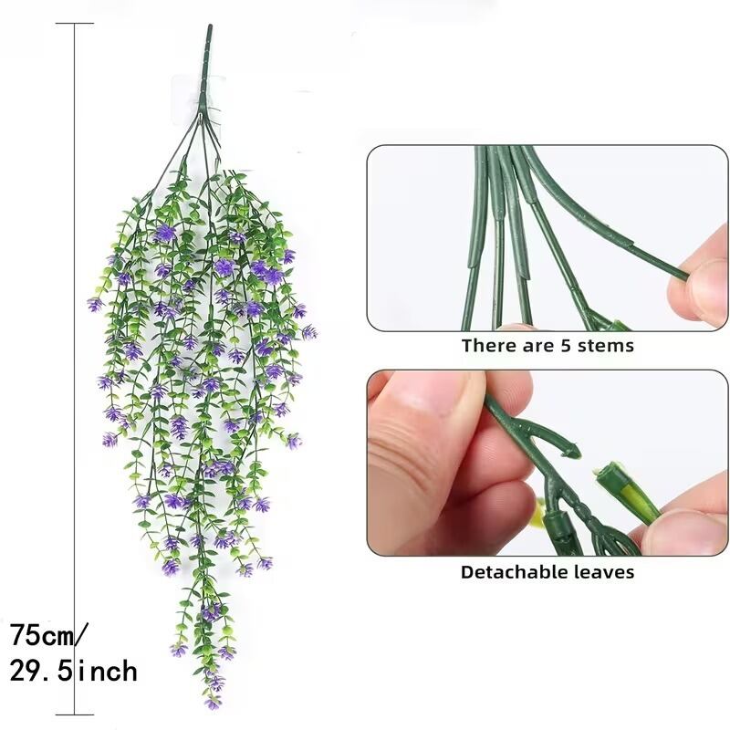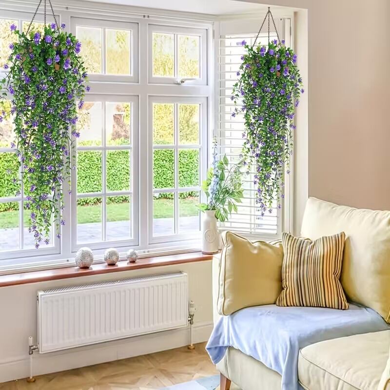 紫の花が優雅に咲き誇る吊り下げ式のつるが、あなたの空間をおしゃれでナチュラルな北欧風インテリアに変身させます。