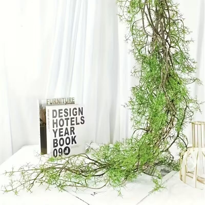 吊り下げ式の人工水生植物が、つるのように優雅に広がり、壁をおしゃれに彩ります。