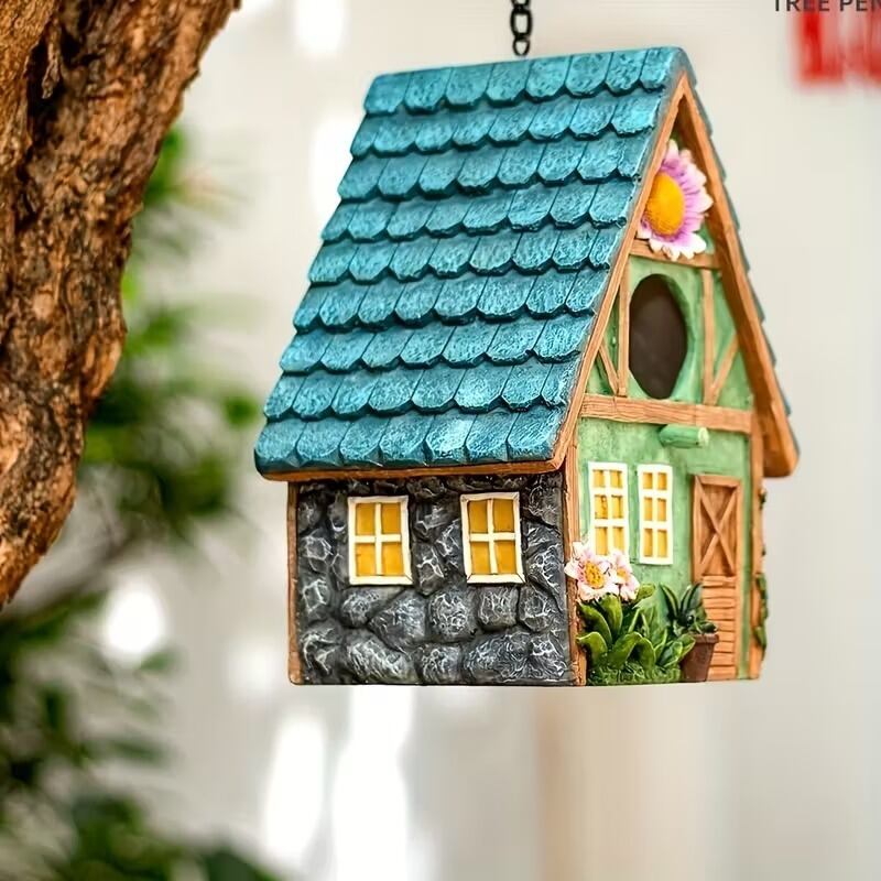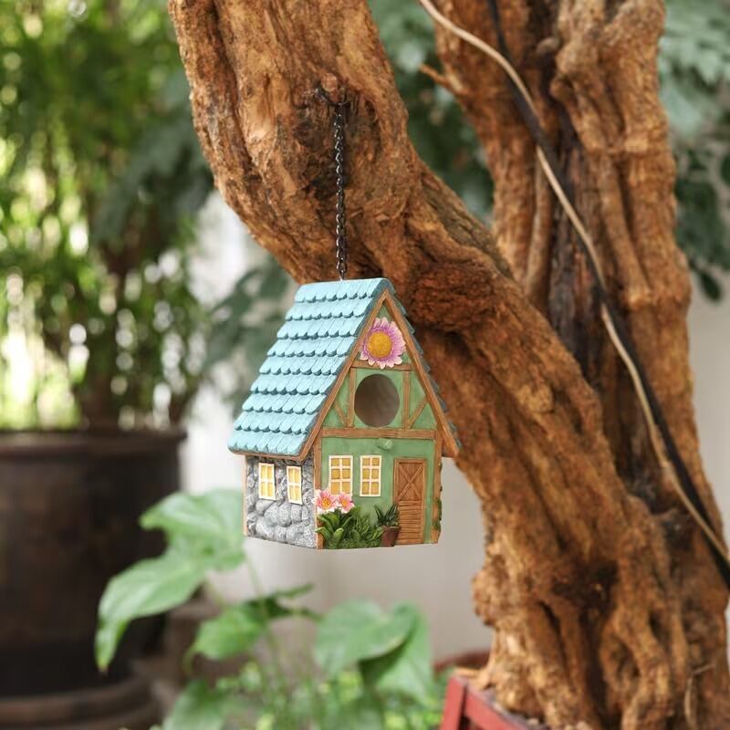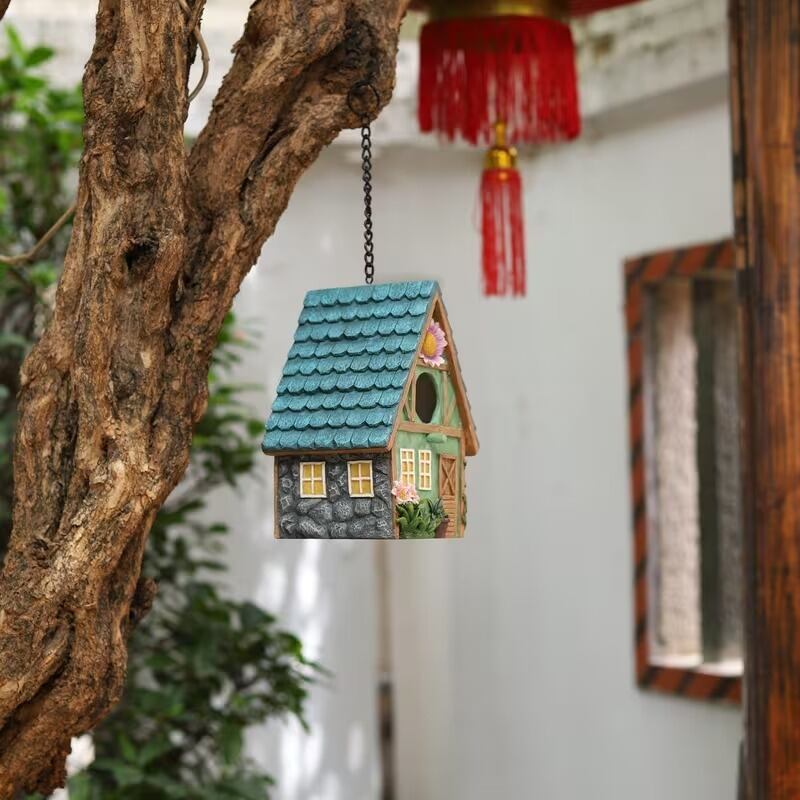 ガーデンオブジェ コテージ 吊り下げ バードハウス カラフル おしゃれ かわいい ナチュラル シンプル 北欧 インテリア ガーデンオーナメント ディスプレイ 飾り 庭 屋外 玄関 雑貨 鳥小屋 巣箱 アウトドア 童話 ギフト 15.5×13×21.4cm