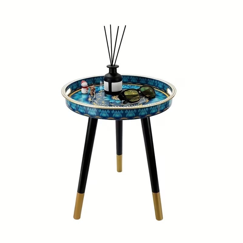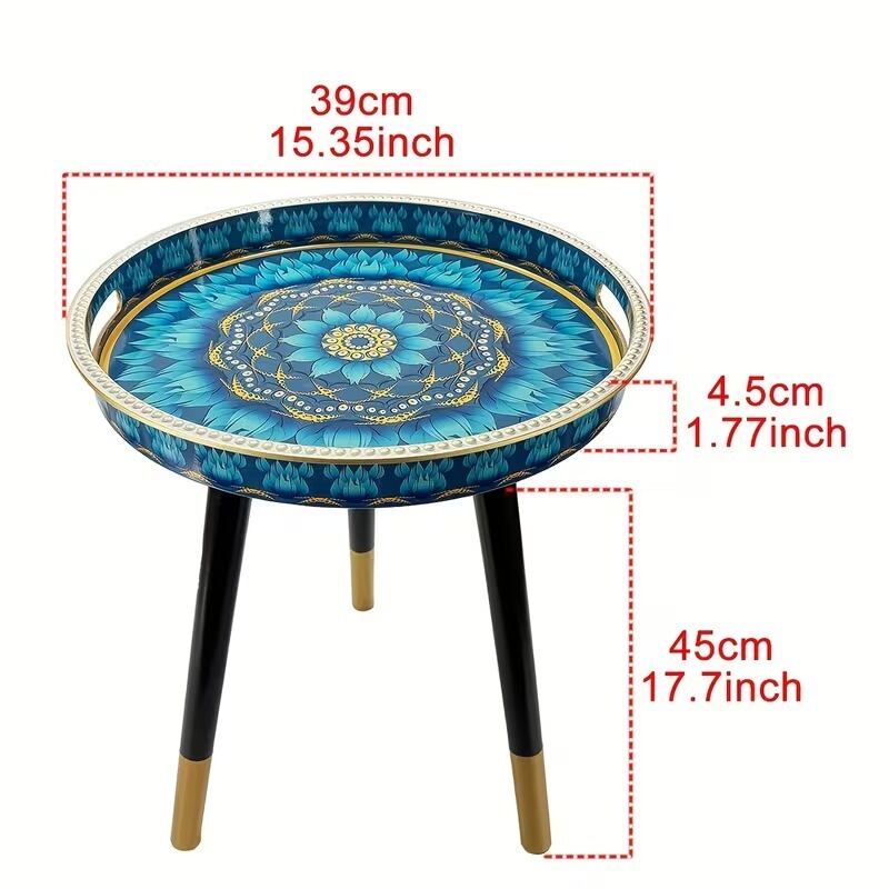 サイドテーブル 丸型 青い花柄 ハンドル付き 華やか おしゃれ かわいい シンプル スタイリッシュ モダン インテリア 北欧 玄関 リビング ベッド 新生活 ナイトテーブル コーヒーテーブル ソファサイド 花台 ミニテーブル 円形 39×49.5cm