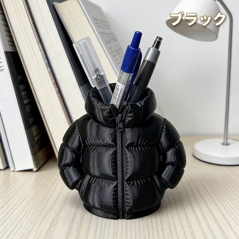 ダウンジャケット型のペン立ては、モノトーンのシンプルさとおしゃれさを兼ね備えたインテリア雑貨です。